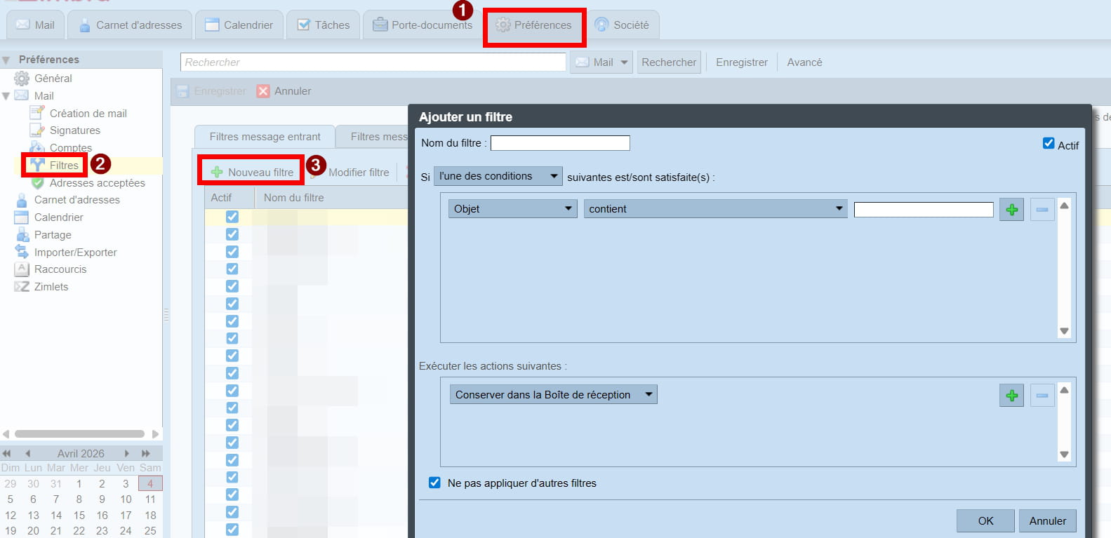 Le filtrage dans Zimbra est très intéressant, car il présente énormément de possibilités et il agit au niveau du serveur. Si vous utilisez un courrielleur comme Thunderbird, vous ne verrez pas les messages bloqués et détruits dans Zimbra.