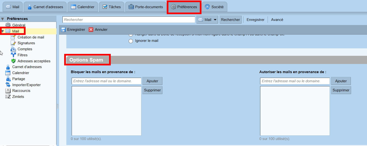 Pour régler l'anti-spam de Zimbra, active le filtrage dans les préférences mail et choisis l'action à appliquer aux spams détectés, comme la suppression automatique.