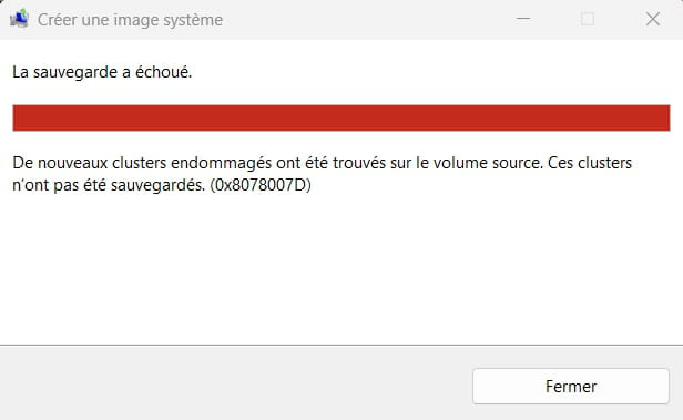 Le message d'erreurs est inquiétant. Il signale des clusters disques défaillants. C'est pourquoi une sauvegarde physique du disque ne peut pas aboutir. C'est quel type de disque, un disque mécanique classique (HD) ou un disque SSD ?