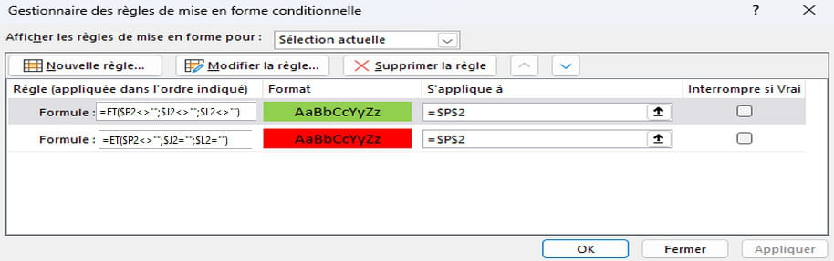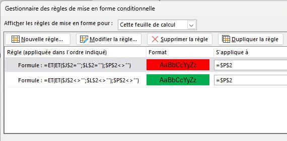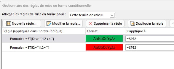 je cherche à faire c'est: Lorsque j’écris dans la cellule P2 et que les cellules J2 et L2 sont vides,la cellule P2 se colorise en rouge et lorsque j’écris dans la cellule P2 et que les cellules J2 et L2 sont remplies alors la cellule P2 se colorise en vert,la cellule P2 ne se colorise pas tant que je n’écris pas dans celle ci.