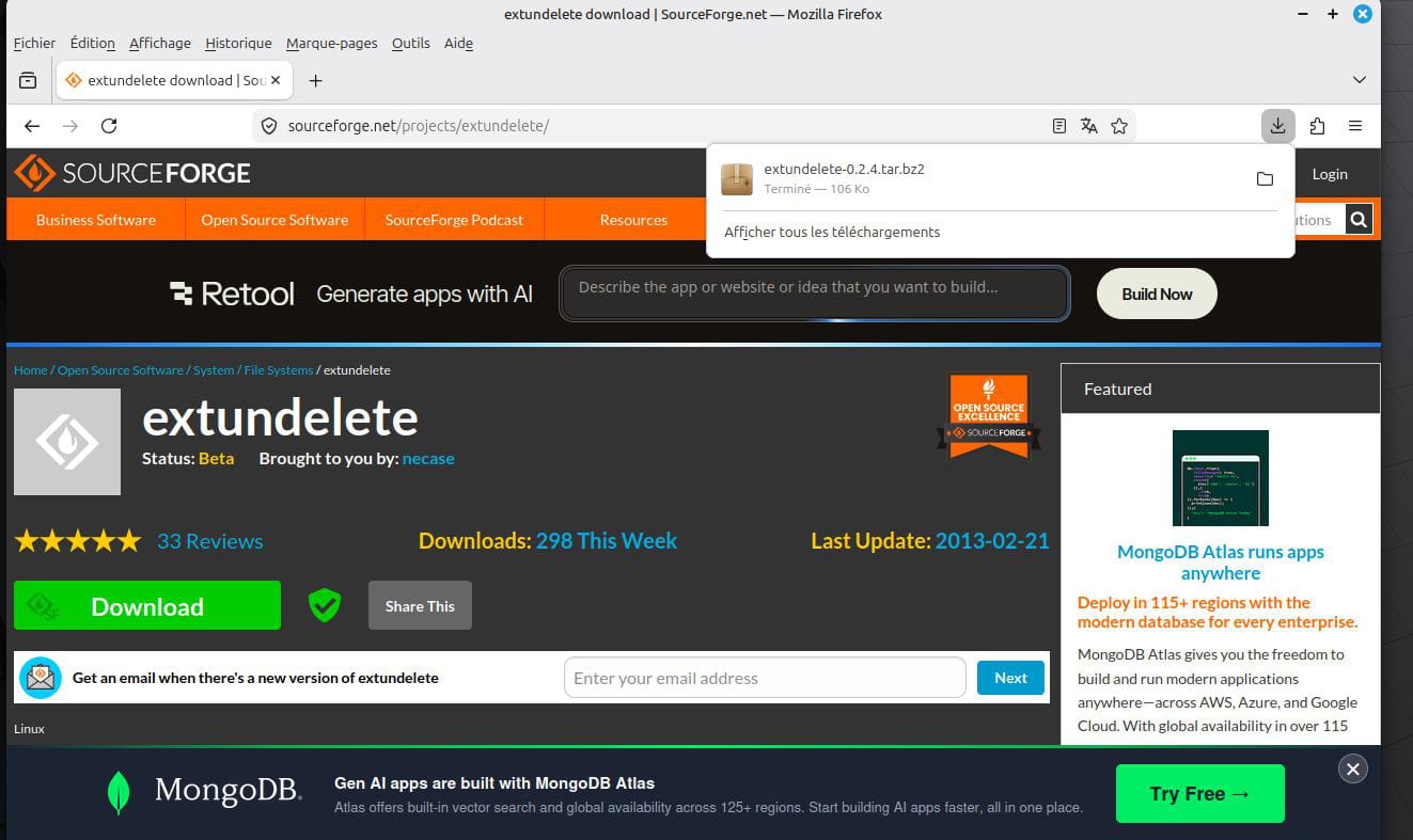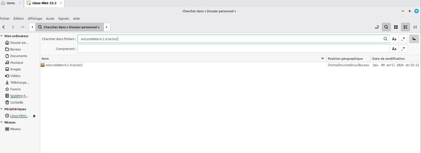 Si je continue à ne rien savoir de tout cela, dans accès, recherche je recherche le nom du fichier téléchargé extundelete-0.2.4.tar.bz2:
