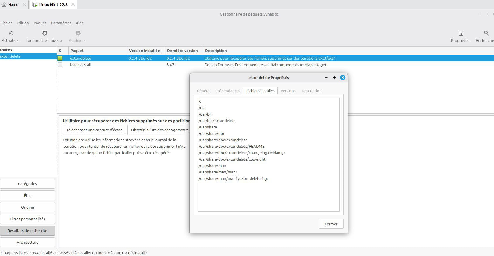 On a facilement la réponse via Synaptics (aussi dans la logithèque, pas installé par défaut dans Linux Mint) en cherchant "extund", propriétés, fichiers installés: par défaut à /usr/bin/extundelete