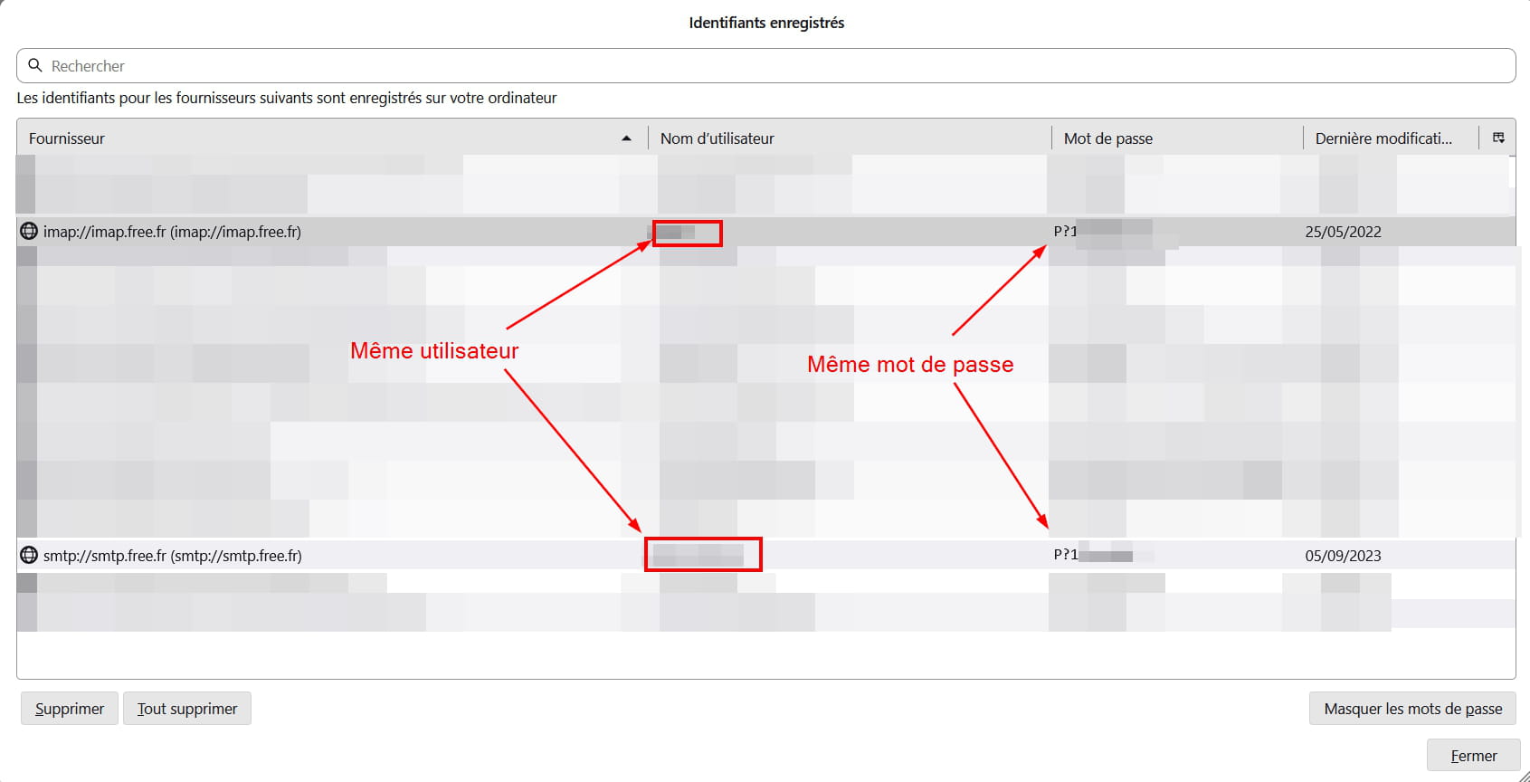 Pour une adresse donnée (même nom d'utilisateur dans le tableau qui correspond au début de l'adresse), il y a une ligne pour la réception (IMAP ou POP) et une ligne pour l'expédition (SMTP). Les mots de passe doivent être les mêmes.