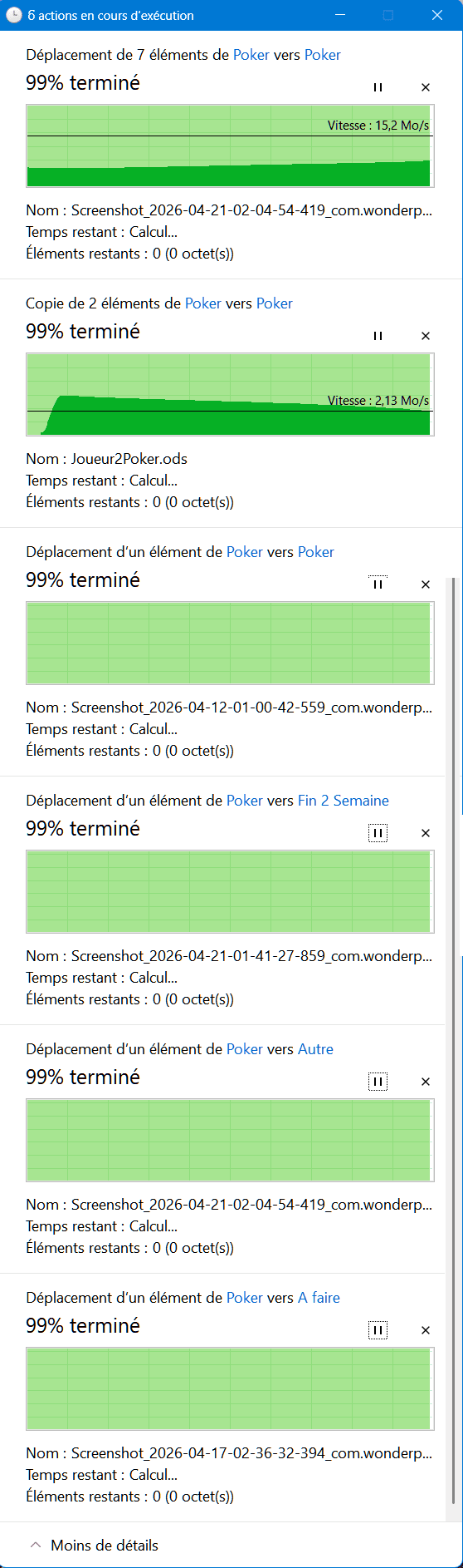 Quand je fais une copie ou un déplacement de fichiers d'un endroit à un autre la fenêtres de transfert s'ouvre puis se bloque sur 99% et reste là pendant de longues minutes pas l'heure mais pas loin.