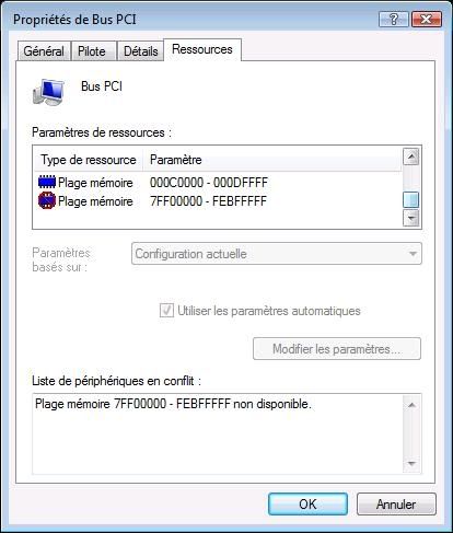 J'ai été vérifier le matériel et les ressource la carte graphique n'a aucun conflit et les pilotes sont à jours de même pour le port racine PCI express jusque la tout fonctionne normalement. Par contre le Bus PCI, a un conflit l'icone d'une des plage de mémoire est barrée et m'indique :