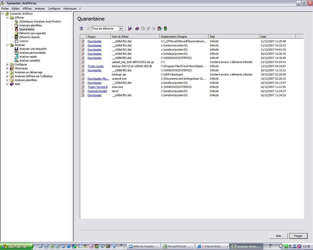 Désolé de ne pas avoir répondu + tôt, pour info l'analyse complète symantec n'a rien trouvée et le nettoyage de la quarantaine ne donne ceci :