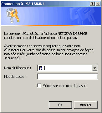Le serveur 192.168.0.1 à l'adresse NETGEAR DG834GB requiert un nom d'utilisateur et un mot de passe.