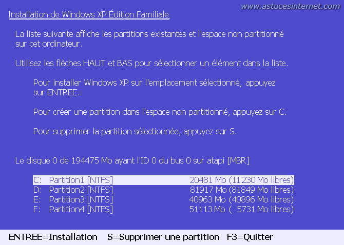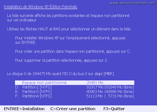 - Tu reviens alors sur cette image où C: représente une nouvelle partition. Sélectionne la partition de C: puis tape alors sur <Entrée> pour installer Windows.