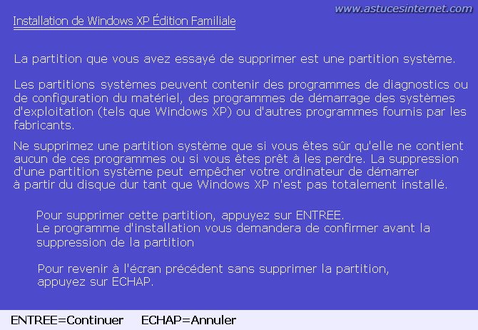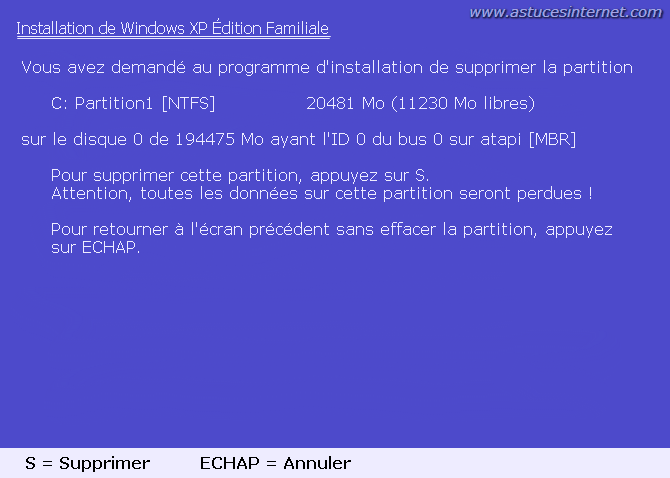 - Ensuite sélectionne la partition de C: puis choisis supprimer (appuis sur 's').