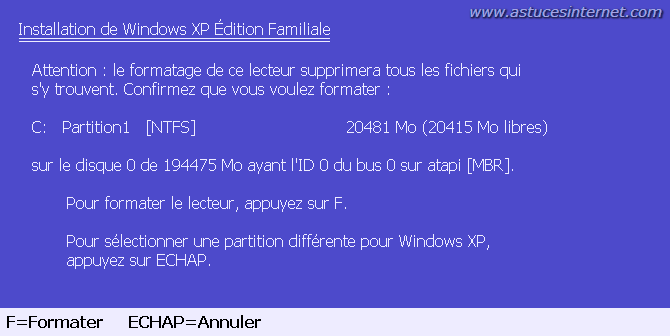 - A l'écran de confirmation de formatage appuis sur 'F' pour accepter. Le formatage débute.
