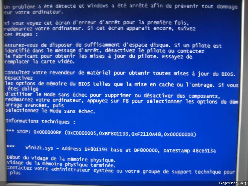 depuis 3 mois maintenant dès le démarrage de l'ordinateur ou durant l'utilisation quelques fois plusieurs dizaines de minutes l'ordi affiche un écran bleu comme suit : http://www.imageshotel.org/images/tinog/img_3917.jpg